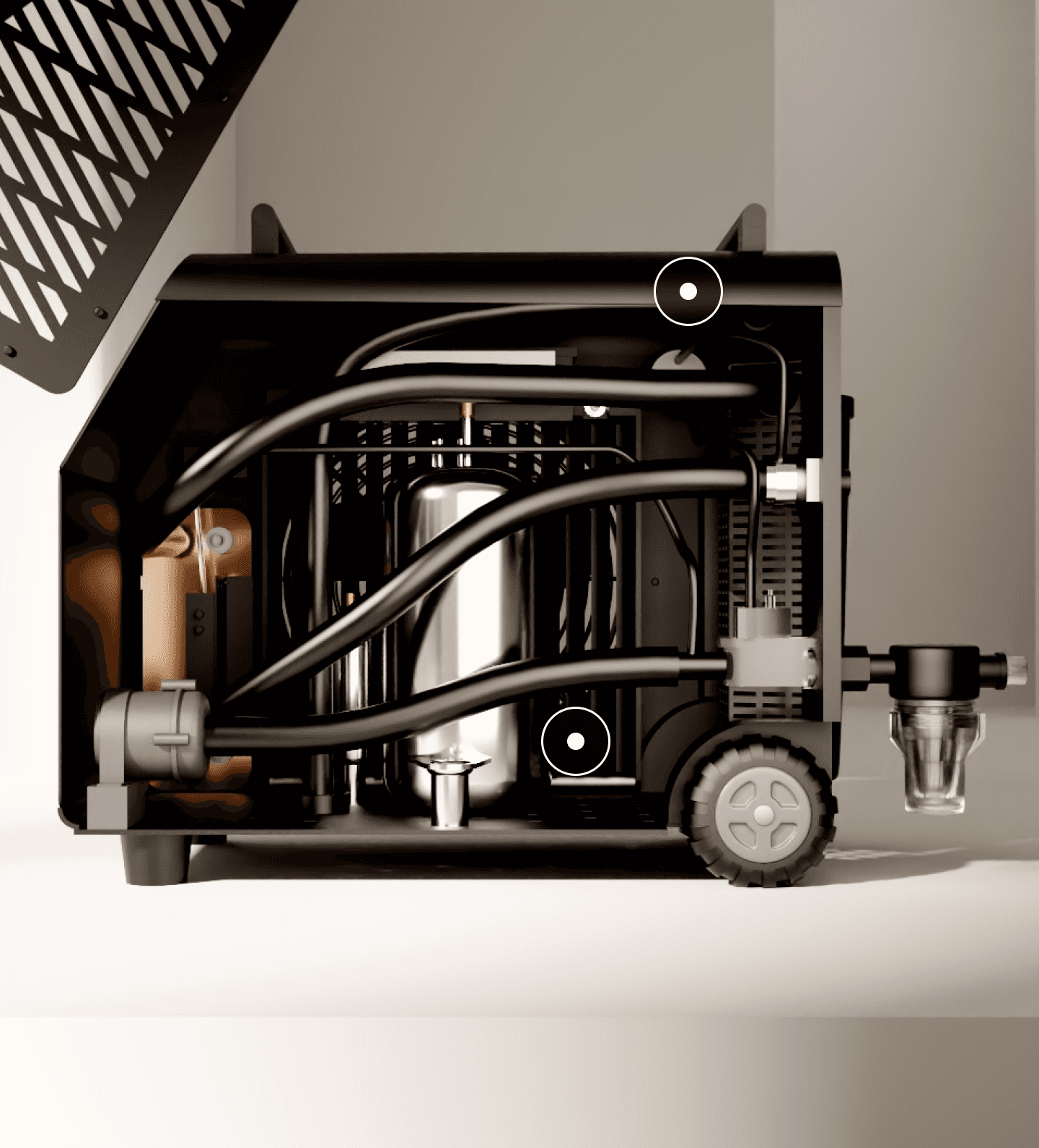 20-micron pleated PET filter removes smaller particles and dust